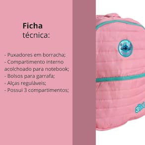 Características: - dimensões: 45 cm de altura x 31 cm de largura x 15 cm de profundidade, com capacidade aproximada de 21 litros. - material: feita de 100% poliéster, com forro também em poliéster, garantindo durabilidade e resistência. - estrutura: possui 03 compartimentos para melhor organização e uma alça de mão reforçada para transporte prático. - estilo único: logo emborrachado e design exclusivo do stitch que encanta fãs de todas as idades.