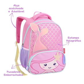 - Estampa encantadora com tema sereia e cores vibrantes - Detalhes Holográfica - Compartimento principal espaçoso - Bolsos laterais para garrafinha - Alças acolchoadas e ajustáveis para maior conforto - Material leve, resistente e fácil de limpar - Puxadores Emborrachados - Identificador no Verso - Bolso Lateral - Alça De Mão