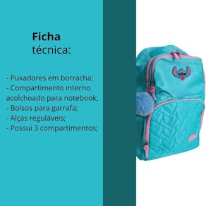 Características: - dimensões: 45 cm de altura x 31 cm de largura x 15 cm de profundidade, com capacidade aproximada de 21 litros. - material: feita de 100% poliéster, com forro também em poliéster, garantindo durabilidade e resistência. - estrutura: possui 03 compartimentos para melhor organização e uma alça de mão reforçada para transporte prático. - estilo único: logo emborrachado e design exclusivo do stitch que encanta fãs de todas as idades.