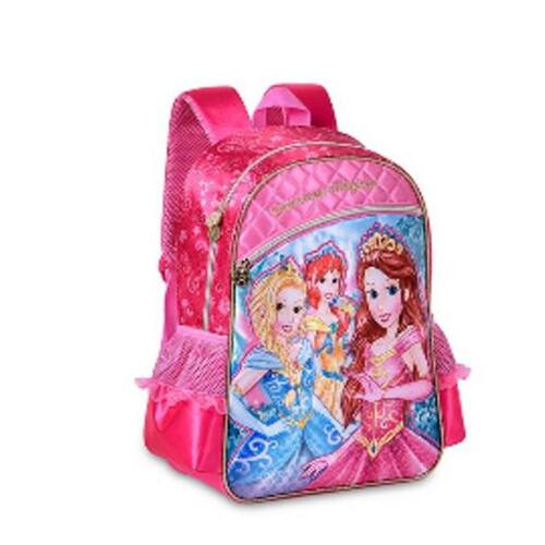 Mochila de Costa Princesas Mágicas. Mochila de costa com dois bolsos laterais telados, uma divisória com fechamento em ziper e um bolso frontal, alça de costa acolchoada, alça de mão confeccionada em cetim com frente em PVC prensado em baixo relevo com detalhes em glitter e puxadores em metal personalizados. Contém: 1 mochila Medidas: Altura-34cm Largura-27cm Profundidade-11cm Composição: Poliéster