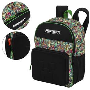 Características; Ocasião: Escolar, dia a dia, passeio Alça de mão Alça de costas acolchoada reforçada 1 Compartimento 1 Bolso frontal 2 Bolsos laterais para garrafa Etiqueta de identificação nas costas Estampa personalizada Minecraft