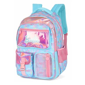 Marca: Luxcel (Licenciado Oficialmente Barbie) Personagem: Barbie Cor Predominante: AZUL CLARO/TURQUESA com detalhes em PINK. Detalhes Holográficos: Bolsos frontais e logo em material holográfico/iridescente que brilha. Estampa: Padrão sutil com logos e óculos da Barbie. Tamanho (G): Amplo espaço interno, ideal para cadernos grandes e materiais escolares. Conforto: Alças de costas acolchoadas e ajustáveis e alça de mão superior. Compartimento principal com zíper. Bolsos frontais diversos (um com aba e fita de ajuste, e outro com tela/rede, ambos com zíper). Bolsos laterais em rede (mesh) na cor pink para garrafas. Detalhes: Puxadores de zíper personalizados.