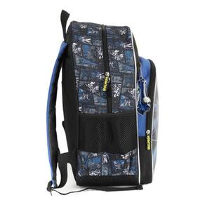 Fabricada em poliéster e pvc , possui alças de costas acolchoadas com regulagens, alça de mão, bolsos laterais em redes elásticas, bolso superior com fechamento em zíper personalizado, etiqueta personalizada em bolso plástico na parte de trás e acolchoado na parte de trás da mochila para as costas da criança.