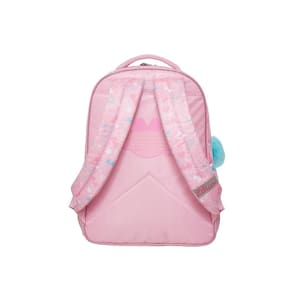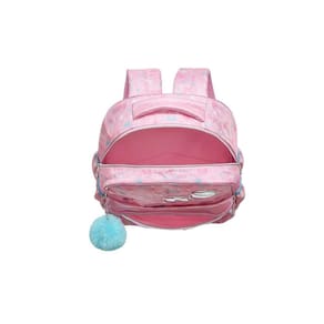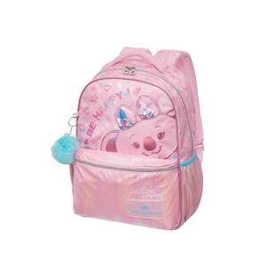 Mochila de costas, que conta com estampa frontal, bolso frontal, telinha lateral, compartimento grande com fechamento em zíper e etiquetas personalizadas.
