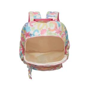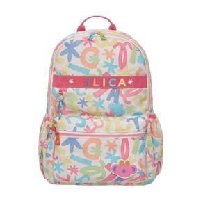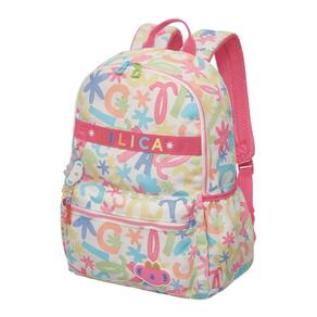 Mochila de costas, que conta com estampa frontal, bolso frontal, telinha lateral, compartimento grande com fechamento em zíper e etiquetas personalizadas.