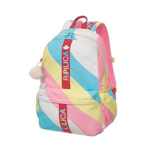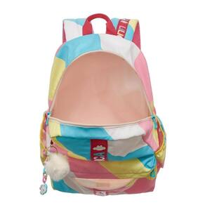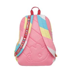Mochila de costas, que conta com estampa frontal, bolso frontal, telinha lateral, compartimento grande com fechamento em zíper e etiquetas personalizadas.