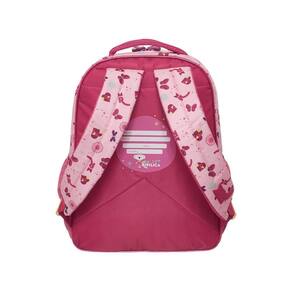 Mochila de costas, que conta com estampa frontal, bolso frontal, telinha lateral, compartimento grande com fechamento em zíper e etiquetas personalizadas.