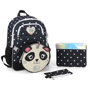 Mochila de costas personalizada, com dois bolsos para armazenamento, aplique frontal de coração holográfico, bolsos laterais em mesh. Lancheira de panda, totalmente personalizada, com alça ajustável e etiquetas personalizadas.