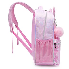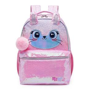 Coleção confeccionada em sarja fina de poliéster, com estampa corrida em foild dourado. Painel frontal com impressão transfer com gradiente em PU com glitter. Orelhas 3D em paetê costuradas no painel frontal. Puxadores de zíper de metal. Bolso frontal em lantejoulas reversíveis rosas iridescentes. Chaveiro com pompom no painel frontal. Patch de PU holográfico iridescente com logo em relevo. Etiqueta de identificação impressa no painel das costas.