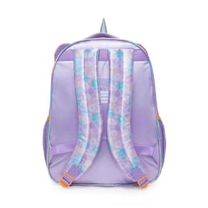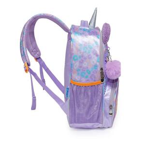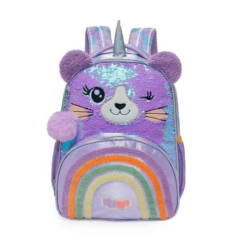 Coleção confeccionada em sarja fina de poliéster, com estampa corrida em foild dourado. Painel frontal com impressão transfer com gradiente em PU com glitter. Orelhas 3D em paetê costuradas no painel frontal. Puxadores de zíper de metal. Bolso frontal em lantejoulas reversíveis rosas iridescentes. Chaveiro com pompom no painel frontal. Patch de PU holográfico iridescente com logo em relevo. Etiqueta de identificação impressa no painel das costas.