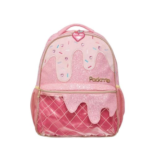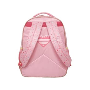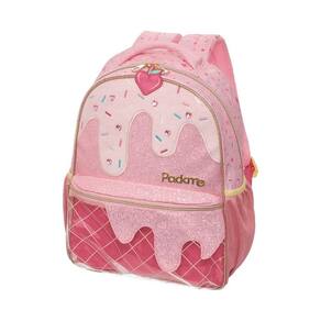 Mochila de costas, que conta com estampa frontal, bolso frontal, telinha lateral, compartimento grande com fechamento em zíper e etiquetas personalizadas.