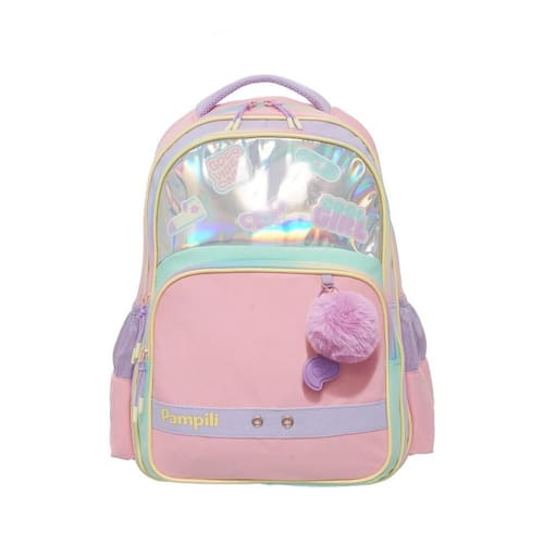 Mochila de costas, que conta com estampa frontal, bolso frontal, telinha lateral, compartimento grande com fechamento em zíper e etiquetas personalizadas.