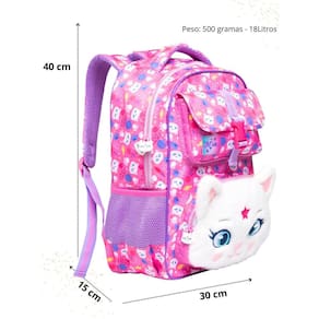 Mochila 16 mia, que veio direto de uma galáxia de fofura para brilhar nas suas aventuras prepare-se para conhecer a mia, uma gatinha estelar que adora brincar com novelos de lã, caçar estrelinhas e proteger os segredos mais preciosos dos pequenos exploradores com um olhar brilhante e uma estrela encantada na testa, ela é muito mais do que uma mochila. Mochila em poliéster com bolso frontal em pelúcia, detalhes do rosto em bordado em alta definição. Com mia ao seu lado, cada dia é uma nova aventura repleta de descobertas e miados mágicos - zíper tratorado de plástico; - puxadores emborrachados personalizados; - detalhes bordado em alta definição; - etiqueta holográfica personalizada; - alça acolchoadas - cadarço listrado duas cores Dimensões: - largura: 30cm - altura: 40cm - comprimento: 15cm Peso: 400gr Cuidados: - guarde em um local seco e arejado evitando locais úmidos. - evite colocar excesso de peso no produto para não forçar os zíperes e costuras. - proteja os objetos cortantes e/ou pontiagudos evitando o contato direto com o produto. - evitar altas temperaturas. - cores claras poderão manchar quando em contato com outros objetos ou roupas de cores pigmentadas.