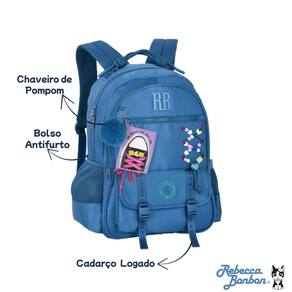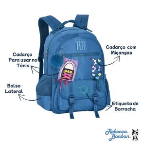 - Estampa oficial da Rebecca Bonbon - Compartimento principal amplo - Bolso frontal com zíper + bolsos laterais - Alças acolchoadas e ajustáveis - Tecido resistente e fácil de limpar - Bolso Antifurto - Chaveiro de Pompom e Par de Cadarço para usar no Tênis