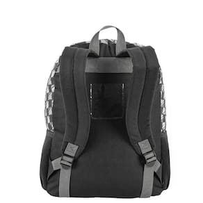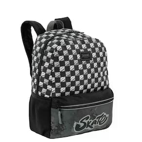 Mochila com bolsos laterias em tela com elástico, alças de costas reguláveis, estampa frontal, bolso frontal com zíper, alça de mão e etiquetas personalizadas.