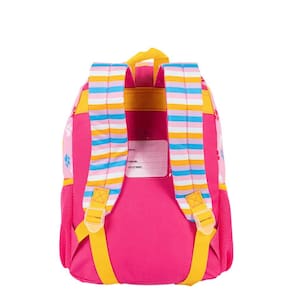 Mochila escolar Sestini com alças de costas espumadas e reguláveis, bolso lateral em tela com elástico, tag identificador, painel frontal em cetim e etiquetas personalizadas.