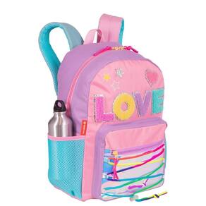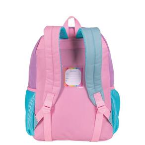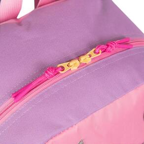 Mochila escolar Sestini com alças de costas espumadas e reguláveis, bolso lateral em tela com elástico, tag identificador, painel frontal em cetim e etiquetas personalizadas.