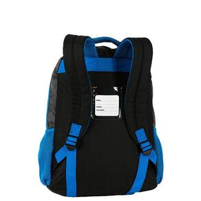 Mochila com bolsos laterias em tela com elástico, alças de costas reguláveis, estampa frontal, bolso frontal com zíper, alça de mão e etiquetas personalizadas.