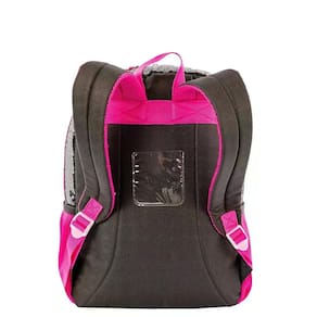 Mochila com bolsos laterias em tela com elástico, alças de costas reguláveis, estampa frontal, bolso frontal com zíper, alça de mão e etiquetas personalizadas.