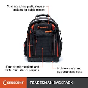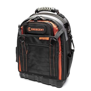 Crescent Mochila bolsa de ferramentas | CTB1000 - A mochila de nível profissional é ideal para o uso diário, com um bolso frontal ajustável para guardar itens grandes, como cabos elétricos - 4 bolsos externos e 34 bolsos internos para todas as peças, bem como bolsos externos para as ferramentas usadas com frequência - A base rígida de polipropileno é resistente à umidade e resiste a ambientes difíceis para durabilidade duradoura - O interior laranja brilhante ajuda você a encontrar suas ferramentas mais rapidamente em ambientes mais escuros - Feita com poliéster 1680D e ferragens de metal para suportar os locais de trabalho mais difíceis - As mangas de bolso mantêm as ferramentas no lugar sem perder pequenos pedaços nos bolsos - Bolso magnético especializado armazena itens para acesso rápido - A alça ergonômica é fácil de pegar e oferece uma aderência confortável e antiderrapante - Inclui um suporte para garrafa de água e um clipe de fita métrica para maior comodidade