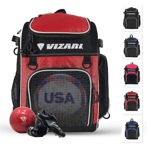 Vizari Mochila de futebol com compartimento de bola e bolso de bola ventilado e bolsos cargo laterais de malha para adultos e adolescentes