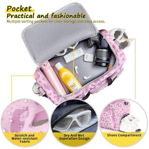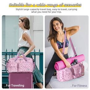 Bolsa de ginástica feminina com compartimento para sapatos, capacidade de 37 L, ideal para viagens, academia, esportes, mochila, fim de semana, rosa leopardo - Bolsa de ginástica robusta: a bolsa de ginástica para mulheres é feita de tecido de alta densidade e forro que é robusto e leve. Ideal para uso prolongado - Bolso molhado e compartimento para sapatos: o bolso molhado é perfeito para armazenar roupas ou toalhas suadas após o treino; o compartimento para sapatos permite que você armazene e acesse facilmente seus sapatos de ginástica sem sujar o compartimento principal - Bolsa de viagem adequada para aviões: o tamanho desta bolsa de viagem é de 45 x 28 x 28 cm, ideal como bolsa de mão. Com alça de ombro ajustável adicional e manga de carrinho integrada, a bolsa pode ser transportada com você para qualquer lugar, tornando sua viagem muito fácil - Vários bolsos: a bolsa esportiva tem muitos bolsos práticos para facilitar a organização: 2 bolsos frontais para guardar pequenos pertences; 1 bolso lateral para o seu guarda-chuva; 1 bolso traseiro para carrinho projetado para bilhetes de loja - Vários cenários aplicáveis: a bolsa multifuncional é uma ótima opção para ser usada de várias maneiras: academia, treino, esportes, dança, balé, natação, viagem, fim de semana, pernoite, hospital etc