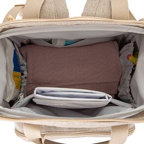 Mochila em sintético impermeável e revestimentos térmicos. Possui bolsos internos, bolso frontal com detalhes em poliéster, alças acolchoadas muito confortáveis e bolsos laterais com abertura de 4cm. Acompanha trocador.