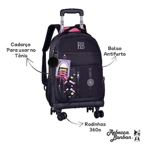 - Rodas 360º, mais mobilidade e leveza no transporte - Estampa oficial da Rebecca Bonbon - Compartimento principal espaçoso + bolso frontal com zíper - Alças de costas acolchoadas - Alça de Mão - Material resistente, leve e fácil de limpar - Cadarço Personalizado - Chaveiro Pesonalizado - Compartimento para Laptop+ Tablet - Forro Rosa Listrado