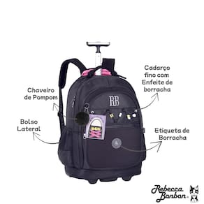 A mochila perfeita para meninas que amam se destacar com charme e funcionalidade! Com rodinhas resistentes, alça tipo carrinho e estampa oficial da Rebecca Bonbon, ela é ideal para escola, passeios ou viagens curtas.
