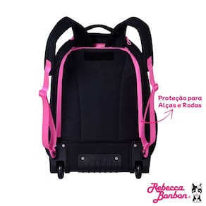 Características Mochila: - Estampa oficial da Rebecca Bonbon - Rodinhas resistentes - Alça retrátil tipo carrinho + alças acolchoadas de costas - Bolsos frontais e laterais para acessórios - Compartimento para Laptop + Tablet - Cadarço Com Etiquetas De Borracha - Prensado em Formato de Flores - Preoteção para Rodas e Alças - Chaveiro de Borracha + RB 3D