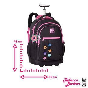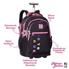Características Mochila: - Estampa oficial da Rebecca Bonbon - Rodinhas resistentes - Alça retrátil tipo carrinho + alças acolchoadas de costas - Bolsos frontais e laterais para acessórios - Compartimento para Laptop + Tablet - Cadarço Com Etiquetas De Borracha - Prensado em Formato de Flores - Preoteção para Rodas e Alças - Chaveiro de Borracha + RB 3D