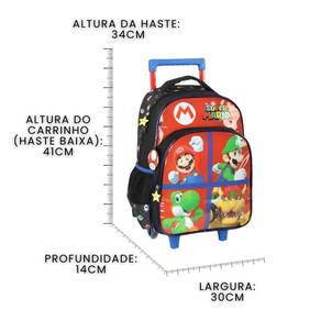 Mochila De Rodas Super Mario Bros Escolar Passeio - Luxcel Apresentamos a incrível Mochila de Rodas Super Mario, perfeita para as aventuras escolares do seu filho Com um design divertido que traz a icônica presença do Super Mario, não é apenas estilosa, mas também super funcional. A mochila de rodas do Super Mario facilita o transporte, ideal para meninos em idade escolar. Com estampa vibrante dos personagens, alças ajustáveis e amplo espaço interno, é perfeita para o dia a dia na escola com estilo e diversão. Características Mochila: Alça de mão Alça de costas Bolsos laterais Identificador personalizado Puxadores em Zíper Especificações Mochila: Marca: Super Mario Medidas Aproximadas Mochila A x L x P : 41cm x 30cm x 14cm Peso: 815g Aprox Capacidade: 17L Composição do produto: Poliéster e PVC Conteúdo da Embalagem: IC41392MO - 1 Mochila Rodas Super Mario As cores podem variar entre as imagens mostradas acima e o produto. Imagens meramente ilustrativas. Todas as informações divulgadas são de responsabilidade exclusiva do fabricante. de 90 dias contra defeito de fabricação. Marca: Não Informado