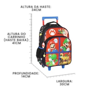 Mochila De Rodas Super Mario Bros Escolar Passeio - Luxcel Apresentamos a incrível Mochila de Rodas Super Mario, perfeita para as aventuras escolares do seu filho Com um design divertido que traz a icônica presença do Super Mario, não é apenas estilosa, mas também super funcional. A mochila de rodas do Super Mario facilita o transporte, ideal para meninos em idade escolar. Com estampa vibrante dos personagens, alças ajustáveis e amplo espaço interno, é perfeita para o dia a dia na escola com estilo e diversão. Características Mochila: Alça de mão Alça de costas Bolsos laterais Identificador personalizado Puxadores em Zíper Especificações Mochila: Marca: Super Mario Medidas Aproximadas Mochila A x L x P : 41cm x 30cm x 14cm Peso: 815g Aprox Capacidade: 17L Composição do produto: Poliéster e PVC Conteúdo da Embalagem: IC41392MO - 1 Mochila Rodas Super Mario As cores podem variar entre as imagens mostradas acima e o produto. Imagens meramente ilustrativas. Todas as informações divulgadas são de responsabilidade exclusiva do fabricante. de 90 dias contra defeito de fabricação. Marca: Não Informado