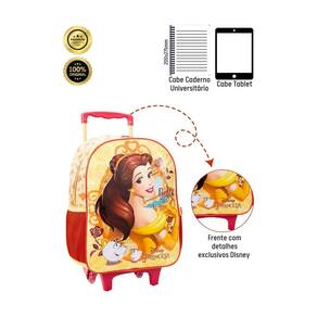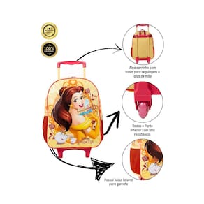 Mochila de Rodinhas da Bela e a Fera Um conto de fadas a cada passo A mochila de rodinhas da Bela e a Fera é mais do que apenas um acessório escolar. É um convite para um mundo de magia e encanto, onde os sonhos se tornam realidade. Com design inspirado na princesa mais inteligente e gentil da Disney, essa mochila é perfeita para meninas que adoram a Bela e a Fera e buscam um item funcional e estiloso para o dia a dia. Principais características: Rodinhas: Facilitam o transporte, tornando o caminho para a escola mais leve e divertido. Bolsos laterais: Ideais para garrafinhas de água e outros pequenos objetos. Alças de mão e de puxar: Versatilidade para carregar a mochila da maneira mais confortável. Cursores personalizados: Um toque especial que encanta as pequenas princesas. Material resistente: Garante durabilidade e acompanha a criança em todas as aventuras. Qualidade: Confeccionada com materiais duráveis, a mochila acompanha a criança por muito tempo. Por que escolher essa mochila Design mágico: A estampa da Bela e a Fera e os detalhes encantadores fazem da mochila um item único e desejado. Funcionalidade: Com diversos compartimentos e bolsos, a mochila organiza todos os materiais escolares com facilidade. Ideal para: Meninas fãs da Bela e a Fera: Um presente perfeito para encantar as pequenas princesas. Dia a dia escolar: Organiza os materiais escolares e torna o caminho para a escola mais divertido. Viagens e passeios: Ideal para transportar brinquedos e lanches.