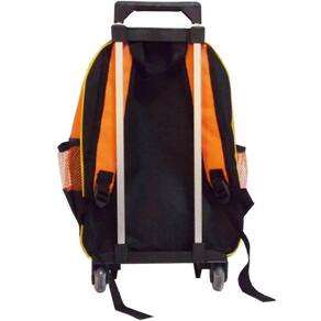 Mochila de carrinho TAM G: Com rodinhas de silicone e alças para as costas. Possui um compartimento central para cadernos e livros, um bolso frontal para objetos e dois bolsos nas laterais de telinha. É produzida com lona e poliéster, (material próprio para este tipo de produto.)