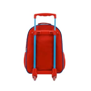 Em tamanho 14", produzida em poliéster resistente e estampado. Painel frontal PVC vincado com detalhes com glitter - Compartimento principal amplo , 2 bolsos laterais mesh, zíper com puxadores personalizados, alça de mão em nylon com poliester e piping forrado. Carrinho em metal com travas.