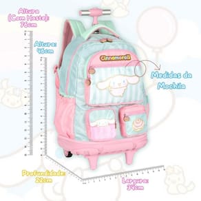 Mochila de Rodinhas Cinnamoroll Hello Kitty Meninas Infantil - UP4YOU - Luxcel Leve a doçura e a magia do Cinnamoroll para todos os lugares Mais do que uma mochila, esta é a companhia perfeita para as aventuras do dia a dia. Com o cachorrinho mais fofo da turminha Hello Kitty, cada ida à escola ou passeio se transforma em um momento especial. Deixe o Cinnamoroll guardar seus tesouros e te acompanhar com muito charme e praticidade. Características Mochila: - Alça Retrátil para Transporte - Descanso Frontal em PU - Detalhes do Cinnamoroll Emborrachados - Bolsos Laterais para Garrafas - Bolsos Frontais Utilitários - Cores Modernas e Vivas - Zíper com Puxadores Personalizados - Estrutura do Carrinho em Alumínio Especificações Mochila: - Marca: UP4YOU - Luxcel - Material: Poliéster - Medidas Aprox. axlxp : 42cm x 34cm x 22cm - Tema: Cinnamoroll - Turma da Hello Kitty - Cor: Verde/Rosa - Capacidade Aprox. litros : 32 litros - Estilo do tecido: Liso com Detalhes Coloridos Conteúdo da Embalagem - MC49694SR - 1x Mochila de Rodinhas Cinnamoroll Hello Kitty Meninas Infantil - UP4YOU - Luxcel As cores podem variar entre as imagens mostradas acima e o produto. Imagens meramente ilustrativas. Todas as informações divulgadas são de responsabilidade exclusiva do fabricante. de 90 dias contra defeito de fabricação. Marca: Não Informado