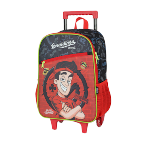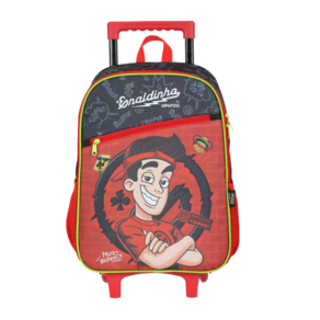 Marca: UP4YOU (Licenciada Oficialmente Enaldinho) Personagem/Tema: Enaldinho (Youtuber) Design de Destaque: Estampa com fundo de tijolos e o Enaldinho em pose descontraída. Cores: Predominantemente Preto, Vermelho e com detalhes de contorno em Verde Neon/Limão. Sistema de Rodinhas: Carrinho embutido e retrátil, com haste resistente e rodinhas que facilitam o transporte, aliviando o peso. Tamanho (G): Ampla capacidade, ideal para materiais escolares e livros. Compartimento principal amplo com zíper. Bolso frontal com zíper e detalhes de frases do Enaldinho. Bolsos laterais em rede (mesh) para garrafas, na cor Vermelha. Detalhes Exclusivos: Puxadores de zíper e logos da marca UP4YOU e "Enaldinho by UP4YOU".