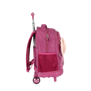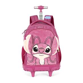 Marca: Luxcel (Licenciada Oficialmente Disney/Lilo & Stitch). Personagem/Tema: Angel. Modelo: Mochila de Rodinhas (Carrinho). Design de Destaque: Rosto da Angel em pelúcia aveludada e orelhas em 3D. Cor Principal: Roxo/Pink. Funcionalidade: Haste retrátil de alumínio e rodinhas. Organização: Compartimento principal amplo, compartimento frontal e bolsos laterais em rede (mesh).