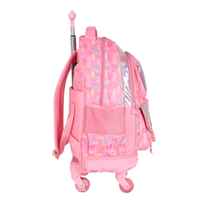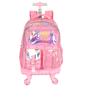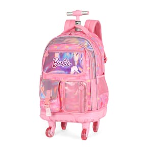 Marca: Luxcel (Licenciado Oficialmente Barbie/Mattel) Personagem: Barbie Cor Predominante: PINK (Rosa) Vibrante. Detalhes Holográficos: Bolsos frontais e detalhes em material holográfico/iridescente que brilha e muda de cor. Estampa: Logos da Barbie em relevo ou padrão em toda a mochila. Sistema de Rodinhas: Carrinho embutido e retrátil com haste de metal. Rodas: Rodinhas de silicone/gel resistentes na cor rosa translúcido. Tamanho (G): Amplo espaço interno, ideal para cadernos grandes e materiais escolares. Compartimento principal com zíper. Bolsos frontais diversos (um com aba e fita de ajuste, e outro com tela/rede, ambos com zíper). Bolsos laterais em rede (mesh) para garrafas. Conforto: Possui alças de costas acolchoadas (para usar quando necessário) e alça de mão. Detalhes: Puxadores de zíper personalizados.