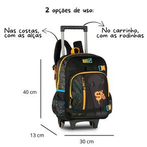 A Mochila de Rodinhas Infantil Masculina Skate SK25046K é a escolha ideal para meninos cheios de energia que querem unir praticidade, resistência e estilo no dia a dia escolar. Confeccionada em poliéster de alta qualidade, apresenta frente em telado duplo, etiqueta emborrachada e puxadores de zíper personalizados que garantem um visual exclusivo. O compartimento principal é espaçoso e acomoda com facilidade livros, cadernos e materiais escolares, enquanto os dois bolsos frontais com fechamento em zíper, sendo um deles com recorte em EVA que cria um efeito 3D incrível, oferecem organização extra. Nas laterais, bolsos telados facilitam o acesso a garrafinhas ou acessórios. A estampa moderna inspirada no universo do skate, com nomes de manobras e símbolos da modalidade, transmite atitude e autenticidade. Versátil e confortável, pode ser Utilizado como carrinho, com puxador em alumínio, rodinhas resistentes e base de apoio frontal, ou nas costas, com alças ajustáveis, acolchoadas e alça de mão superior. Com dimensões aproximadas de 40x30x13cm, é perfeita para acompanhar os pequenos skatistas em cada aventura escolar com praticidade, segurança e muito estilo. Marca: Não Informado Ean: 7899753559018