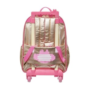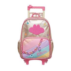 Mochila de rodinhas Lilica Ripilica com alças de costas, que conta com estampa frontal, bolso frontal, telinha lateral, compartimento grande com fechamento em zíper e etiquetas personalizadas.