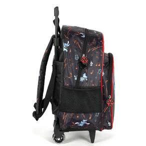 Mochila de rodinhas com alça, bolsos laterias em tela com elástico, alças de costas espumadas e reguláveis, silk frontal, bolso frontal com zíper, alça de mão e etiquetas personalizadas.