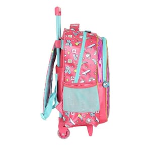 Mochila de rodinhas com alça, bolsos laterias em tela com elástico, alças de costas espumadas e reguláveis, silk frontal, bolso frontal com zíper, alça de mão.