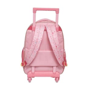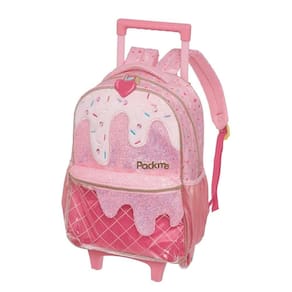 Mochila de rodinhas Pacific com alças de costas, que conta com estampa frontal, bolso frontal, telinha lateral, compartimento grande com fechamento em zíper e etiquetas personalizadas.