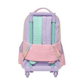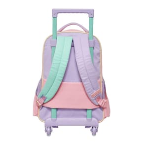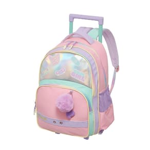 Mochila de rodinhas Pacific com alças de costas, que conta com estampa frontal, bolso frontal, telinha lateral, compartimento grande com fechamento em zíper e etiquetas personalizadas.