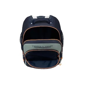 Mochila de rodinhas Tigor T Tigre com alças de costas, que conta com estampa frontal, bolso frontal, telinha lateral, compartimento grande com fechamento em zíper e etiquetas personalizadas.