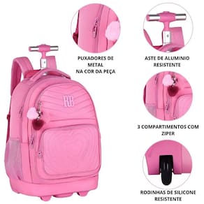 A mochila da linha Rebecca Bonbon, da Clio Style, é um item perfeito para quem busca unir estilo, funcionalidade e durabilidade. Com medidas de 35cm x 48cm x 19cm, esta mochila se destaca por seu design charmoso e prático. Equipada com rodinhas de silicone e uma haste que se eleva até 99cm, é ideal para facilitar o transporte.