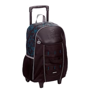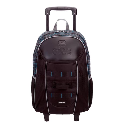 Mochila de rodinhas Sestini sem alça de costas, bolso frontal com zíper, bolso lateral com elástico, tag identificador e painel personalizado.