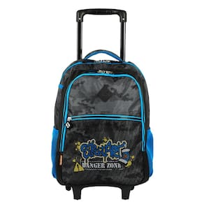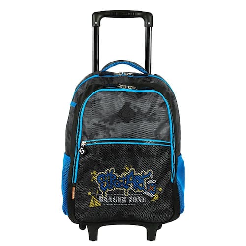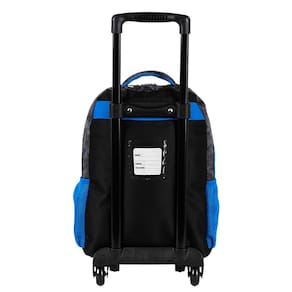 Mochila de rodinhas Sestini sem alça de costas, bolso frontal com zíper, bolso lateral com elástico, tag identificador e painel personalizado.